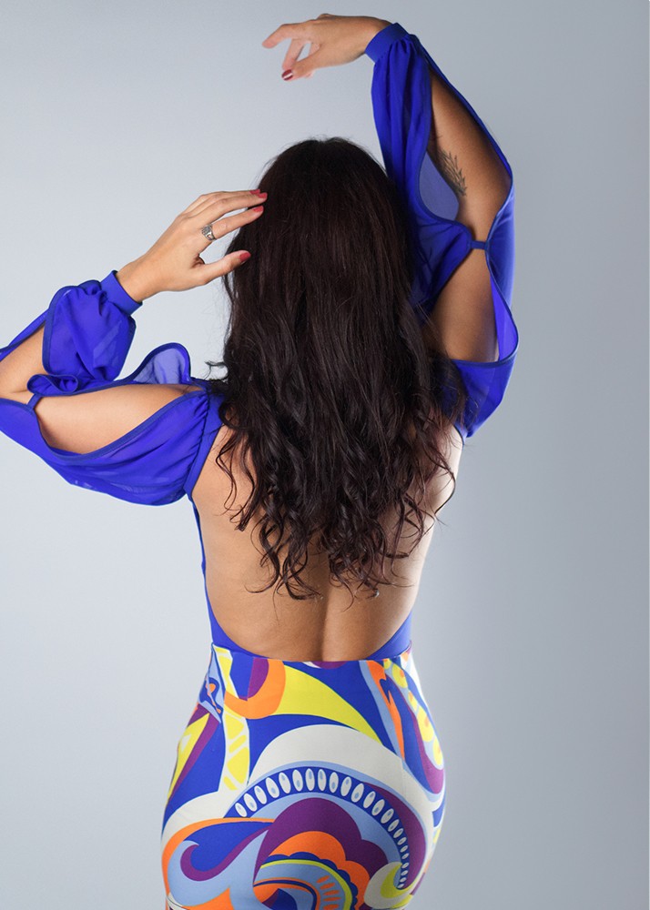 Los bodies Judith están confeccionados y diseñados es España por Desirée Pérez. Su creación fue pensada como prenda para salir a bailar, por eso estos bodies están realizados en licra de primera calidad en el cuerpo y tul en las mangas. Contiene copas extraíbles y son de braguita tanga con cierre de broche. Su vertiginosa espalda descubierta no impide que sean seguros y cómodos. Su diseño embellece los movimientos de los brazos y dota de delicadeza y estilo el outfit. Es la prenda perfecta para momentos especiales.