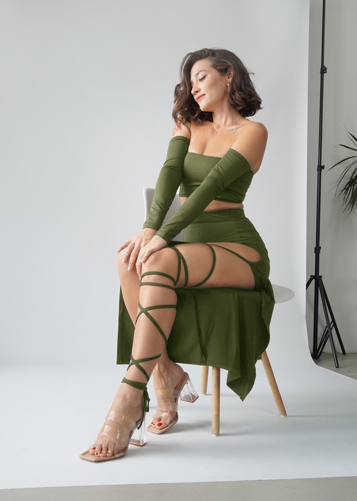 Falda realizada en suave licra que se adapta a tus cadenas, cintura con goma elástica y original abertura con tiras para ajustar alrededor de tu pierna.