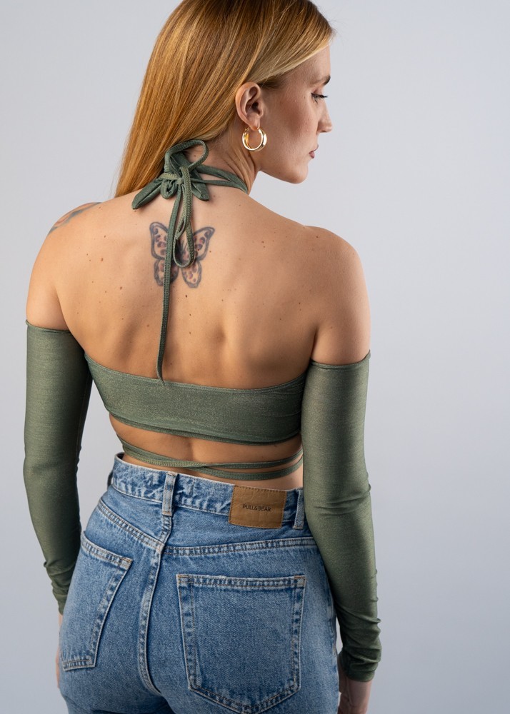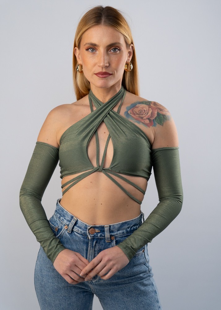 Top cruzado con mangas, totalmente ajustable en cuello y torso. Lycra brillante reciclada.