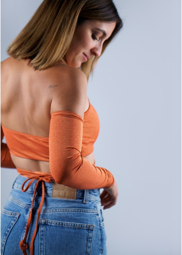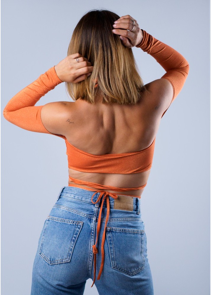 Top cruzado con mangas, totalmente ajustable en cuello y torso. Lycra brillante reciclada.