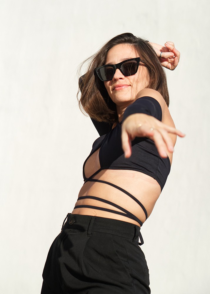 Designed by Desirée Pérez and manufactured in Spain with lycra. Comfortable to move around and goes with everything. Fully adjustable top in the neck and torso, you can create different ways to wear it by playing with the placement of its straps. It has an interior opening so you have the option of wearing it with helmets or cups, they are not included but you can purchase them separately.