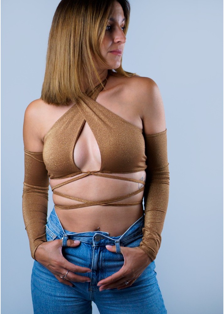 LIMITED EDITION (few units)Wrap top withot sleeves, fully adjustable neck and torso. Fabric with gold line detail.Double-weave fabric on the chest, with a helmet pocket.Bra pads and cups not included; you can add them...