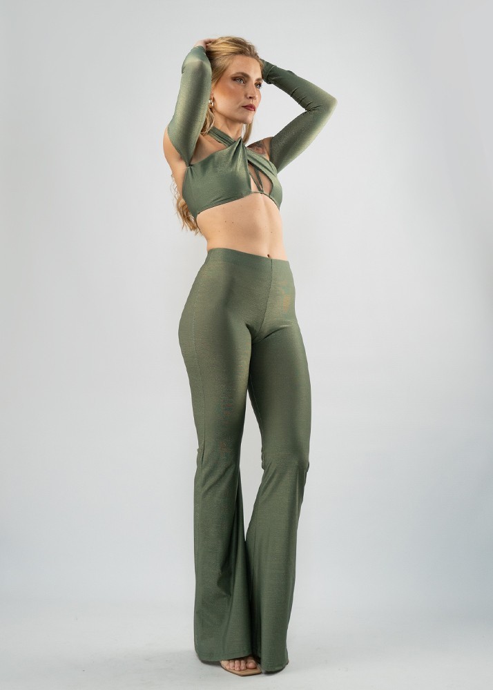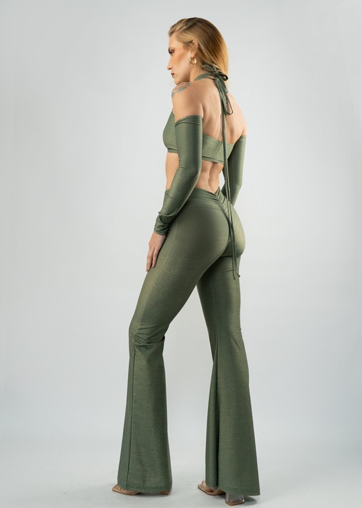 Flared pants made from recycled lycra made from ocean plastics, with an elastic waistband and a gathered back.